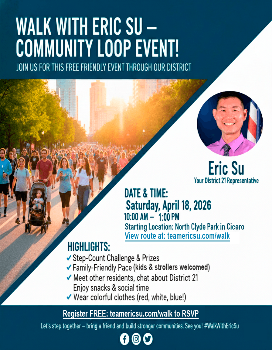 Hi, Iโm Eric Su โ a proud dad, lifelong Illinois resident, and small business owner running to represent IL State Rep. House District 21. Here's a few quick facts about me: